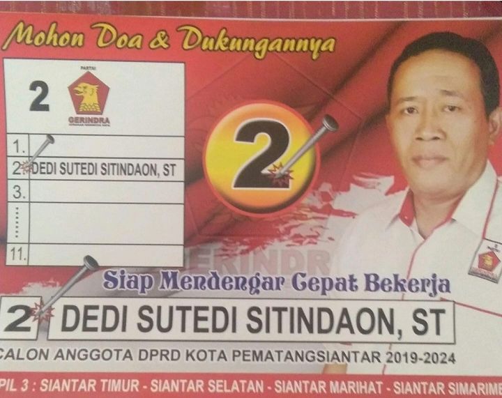 1. Dedi Sutedi Sitindaon, ST untuk DPRD Kota Pematang Siantar dari Partai Gerindra.